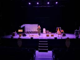 Plus le spectacle avance, plus le personnage humain (ROBERDAM) consomme, acquiert de la modernité, du savoir, et plus le personnage planétaire (Maïna) s’appauvrit, rétrécit, se désole. L’horloge tourne et le temps presse…